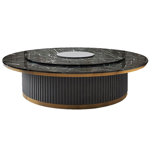 酒店包厢大理石豪华电动餐桌大圆桌,是由黑色大理石桌面钛金包边,底座也用了钛金包边,这样