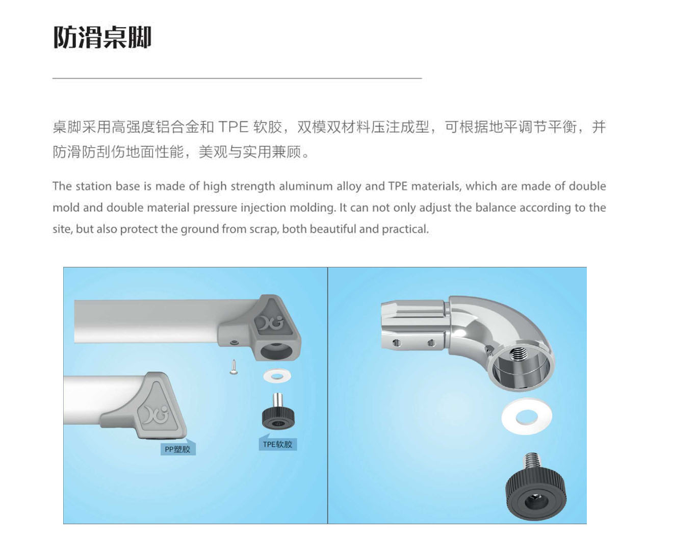 5.桌脚掌:1.5mm壁厚,脚套底有4个平衡调节机构。